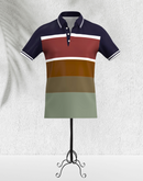 The navy blue collar and sleeves with white striped detailing add a touch of sporty sophistication, while the open placket design ensures a relaxed, comfortable fit. Whether you're heading out for a casual day, a weekend meet-up, or a business-casual event, this polo offers the perfect balance of comfort and style.